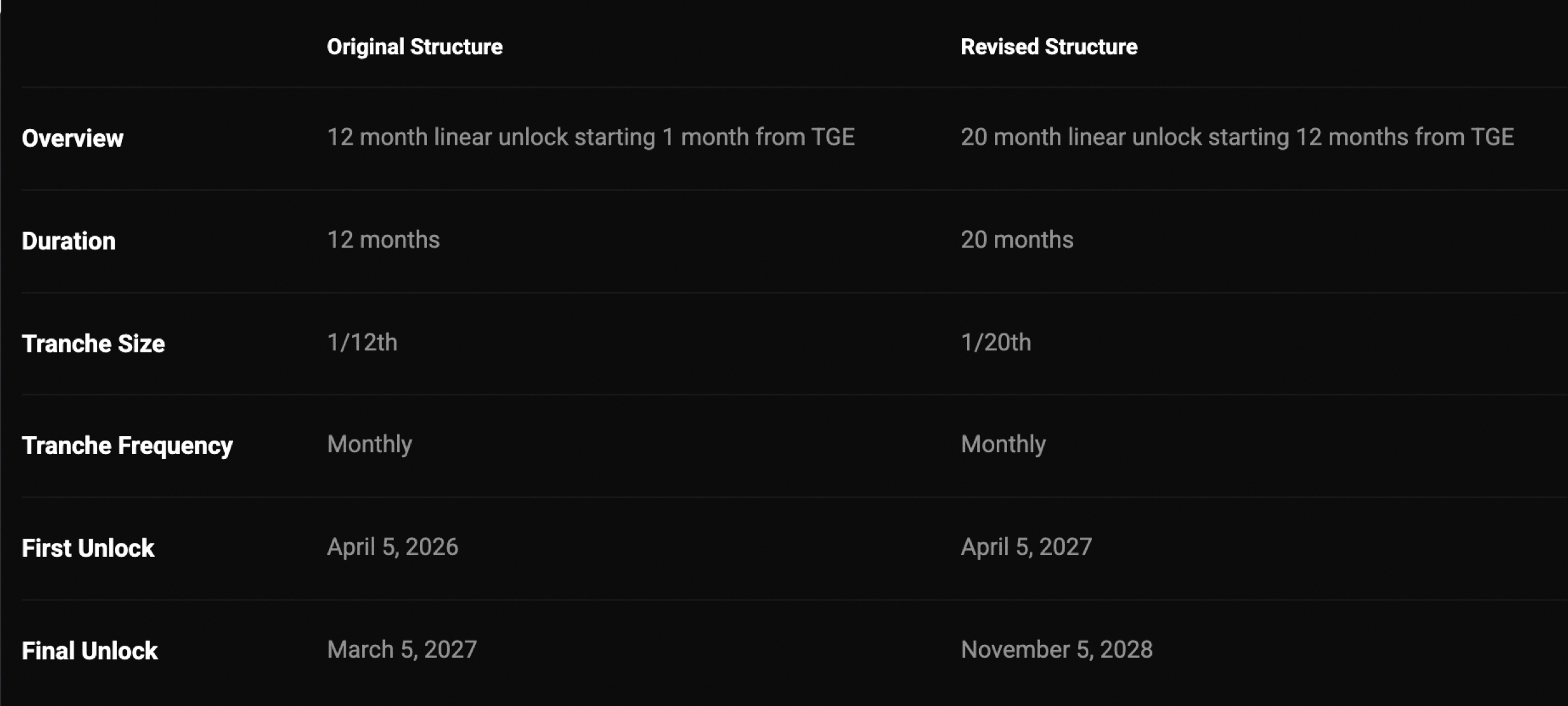 Unlock schedules for Paradex Core Contributors (29.0%) and ex-Paradigm Team members (1.0%) have also been extended, with the cliff moved from March 5, 2027 to August 5, 2027. Importantly, 80% of the Core Contributors allocation is subject to a Dual Trigger unlock condition. Tokens in this tranche unlock only when both conditions are met: