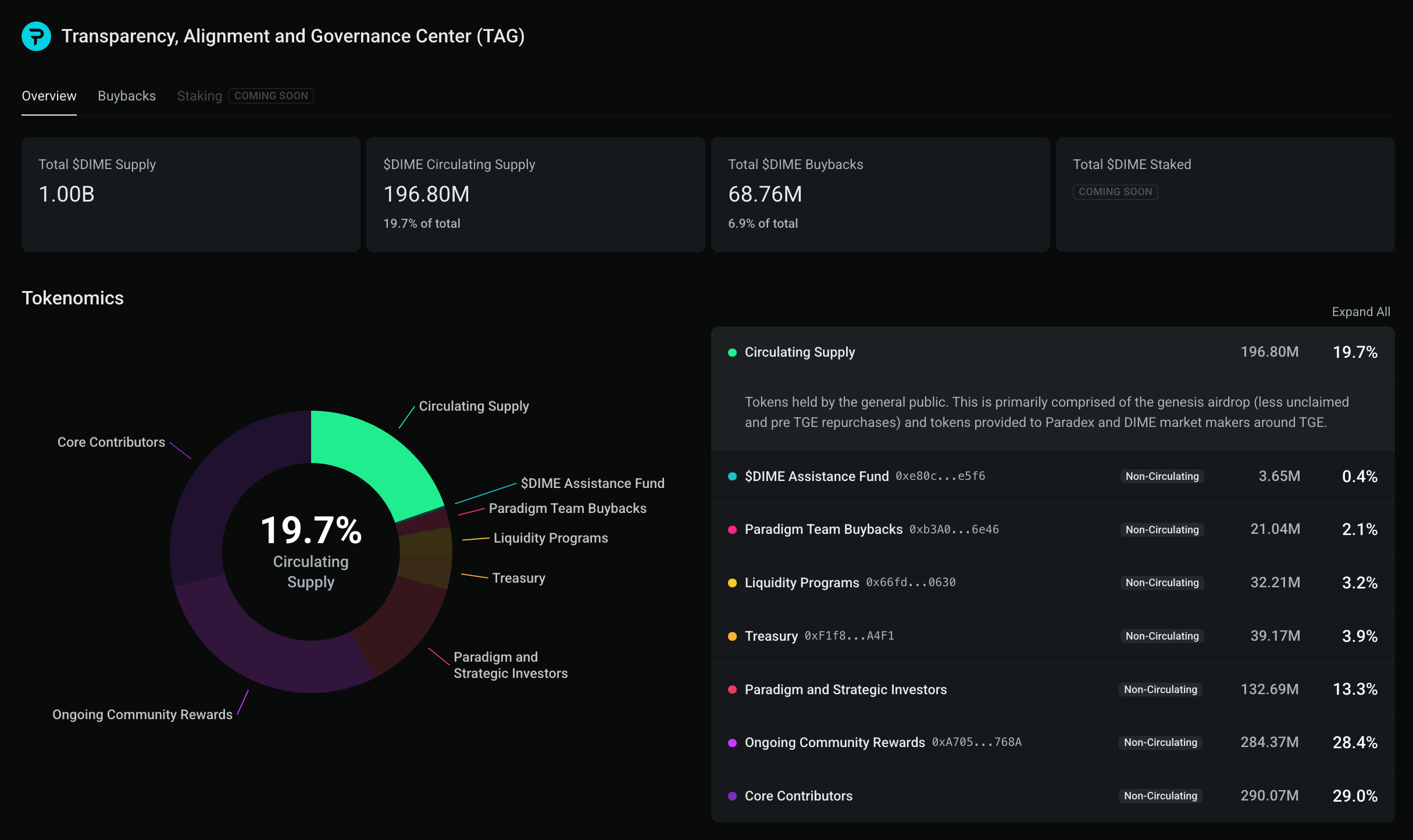 Paradex has launched the $DIME TAG Center – our commitment to best-in-class Transparency, Alignment & Governance for the $DIME Token. As a first step, we've published a new overview dashboard within the Paradex App, surfacing key metrics including Total Supply, Circulating Supply, and $DIME buybacks, with L1 wallets mapped to their tokenomics allocation categories.