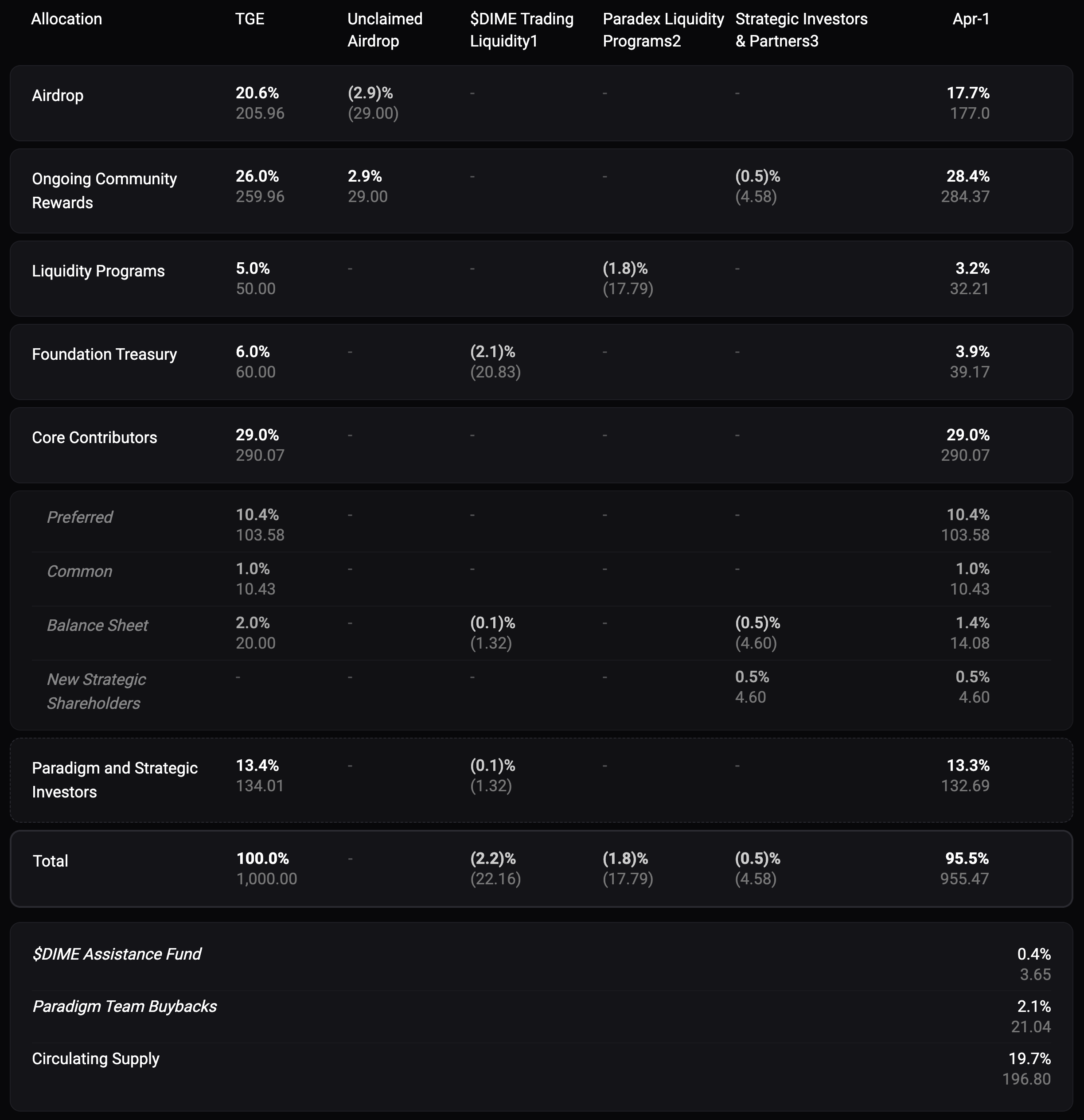 - Prior to TGE, Paradex repurchased 4.4% of $DIME's total supply through XP repurchases, reducing the Genesis airdrop allocation from 25.0% to 20.6%.