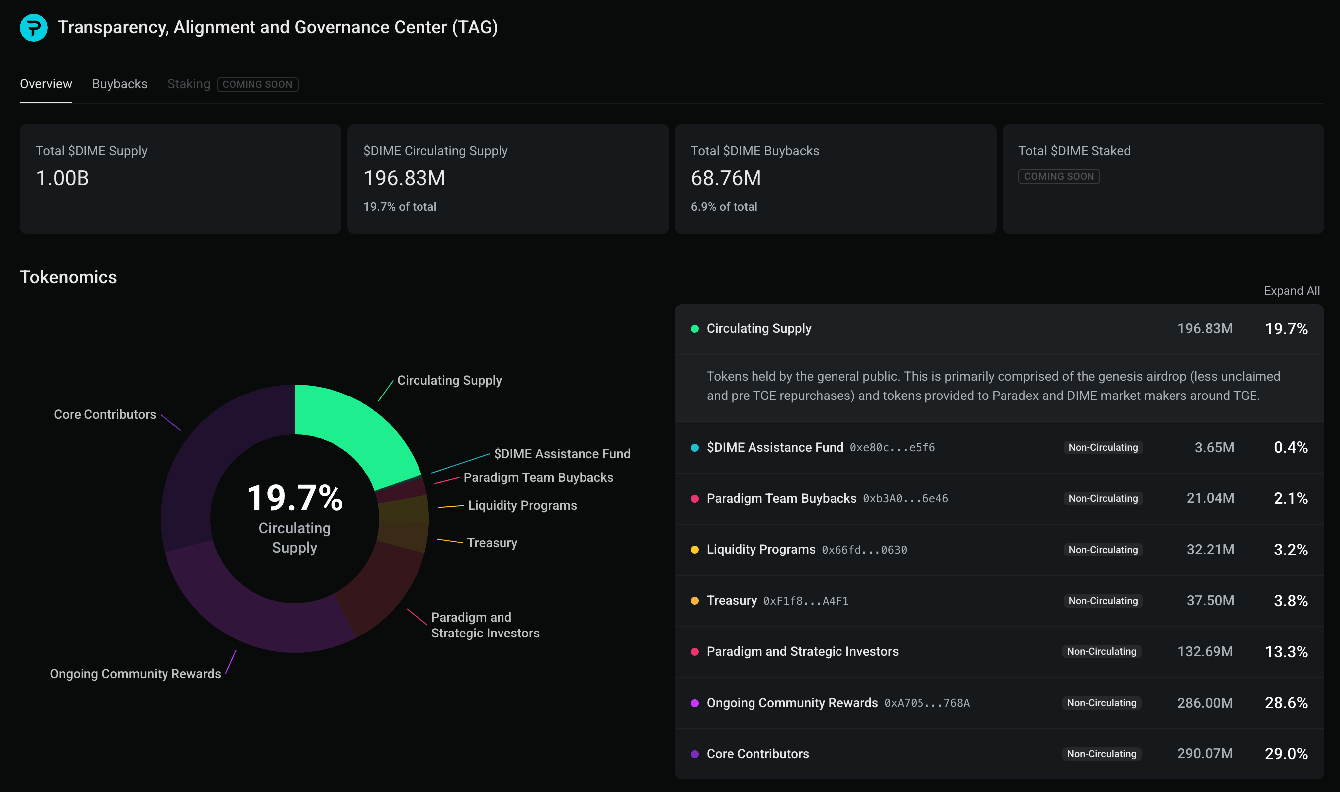 Paradex has launched the $DIME TAG Center – our commitment to best-in-class Transparency, Alignment & Governance for the $DIME Token. As a first step, we've published a new overview dashboard within the Paradex App, surfacing key metrics including Total Supply, Circulating Supply, and $DIME buybacks, with L1 wallets mapped to their tokenomics allocation categories.